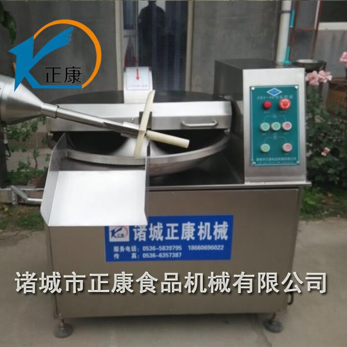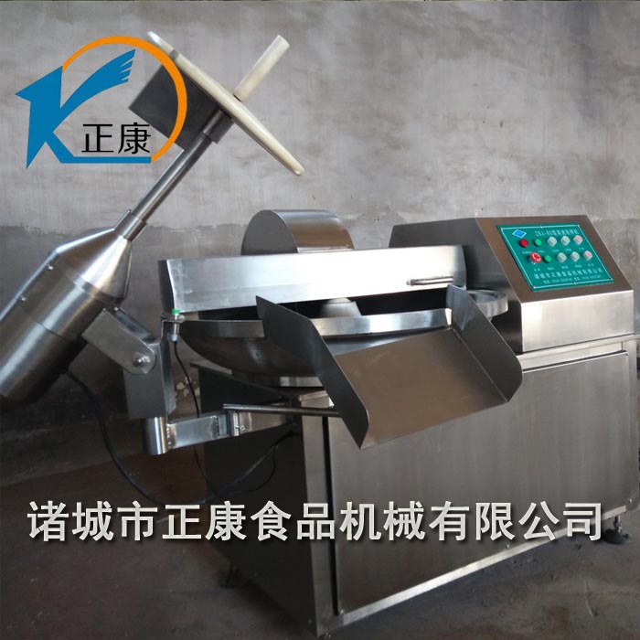 斬拌機是肉類加工中淬取鹽溶性蛋白的重要設備,它的作用就是快速地提取蛋白并將蛋白和原料中的水在2~8℃時凝結(jié)成膠,形成粘稠的乳化物。該原理是通過裝在高速轉(zhuǎn)軸上的6把刀,在可變速的圓盤鍋內(nèi)對肉料進行高速斬切。它對鹽溶性蛋白的提取能力是其它設備無法企及的,好的斬拌機對鹽溶性蛋白的提取能力可達68%。