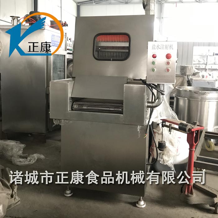 鹽水注射機可將腌制液快速均勻的注射到肌肉組織中去,以提高產(chǎn)品的保存性、風(fēng)味和顏色。傳統(tǒng)的腌制方法有干鹽搓擦和腌制液浸漬,不僅需要很長時間,鹽的擴散也不均勻,鹽量無法準(zhǔn)確控制,質(zhì)量不穩(wěn)定。產(chǎn)品保水性差,出品率低。利用鹽水注射法可加快腌制速度和使鹽水均勻擴散、滲透,可縮短2/3腌制時間,提高產(chǎn)品質(zhì)量,改善保水性,提高出品率。