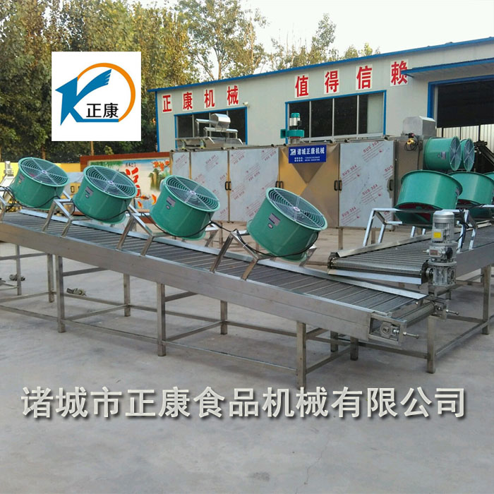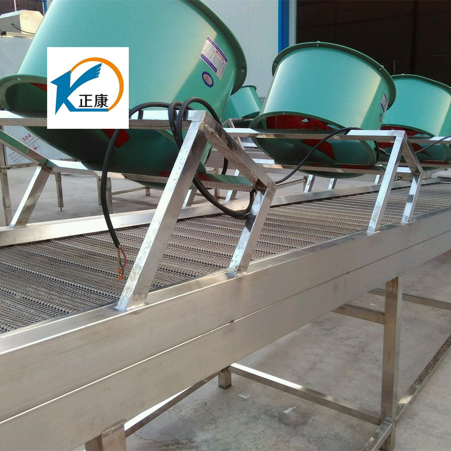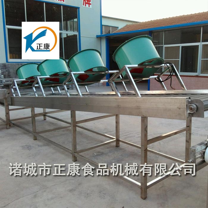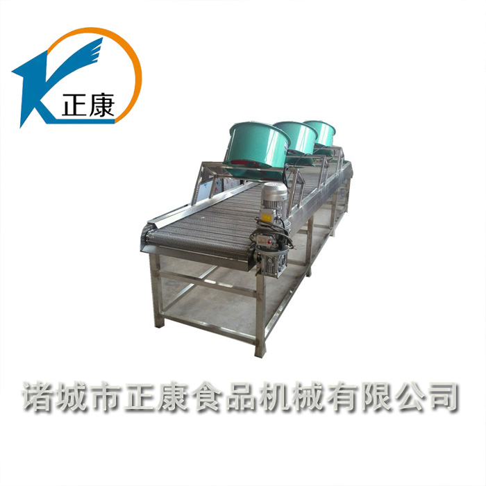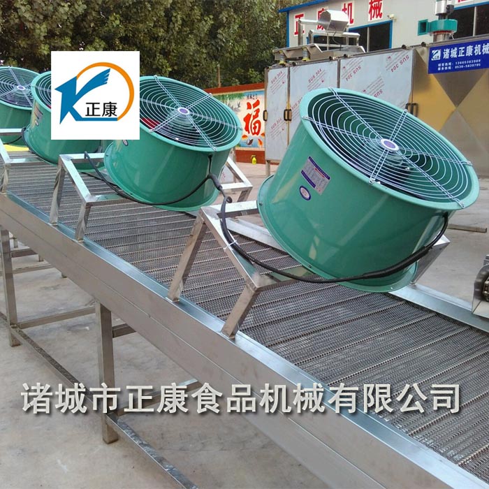 將產(chǎn)品置于輸送帶上,運(yùn)行過程中通過上方的風(fēng)機(jī)將產(chǎn)品吹涼。